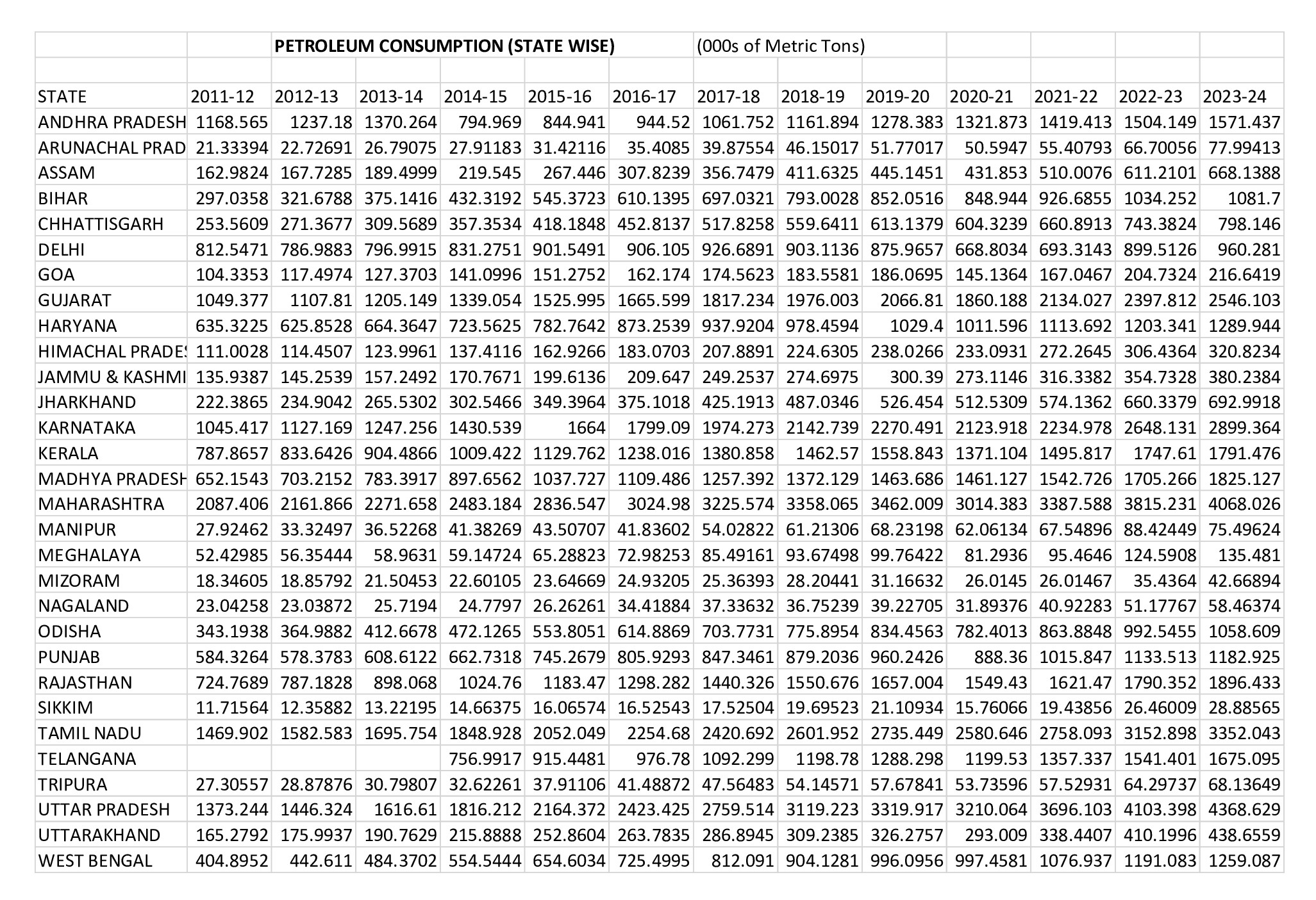 Table-1: Petroleum Consumption in Different States of India (FY2012-FY2024)