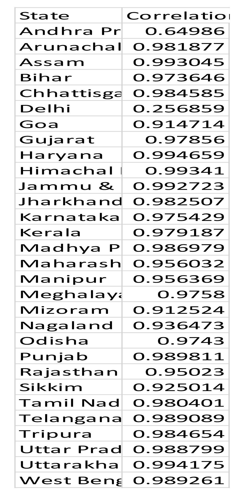 - Surprisingly, The Largest Economy in India, Maharashtra is not having relationship strength of >0.999 with any of India state. It is doing is good business with all the states; however not very close or more perfect correlation with any Indian states. It is like all-rounder; not focused on specific one or two states.