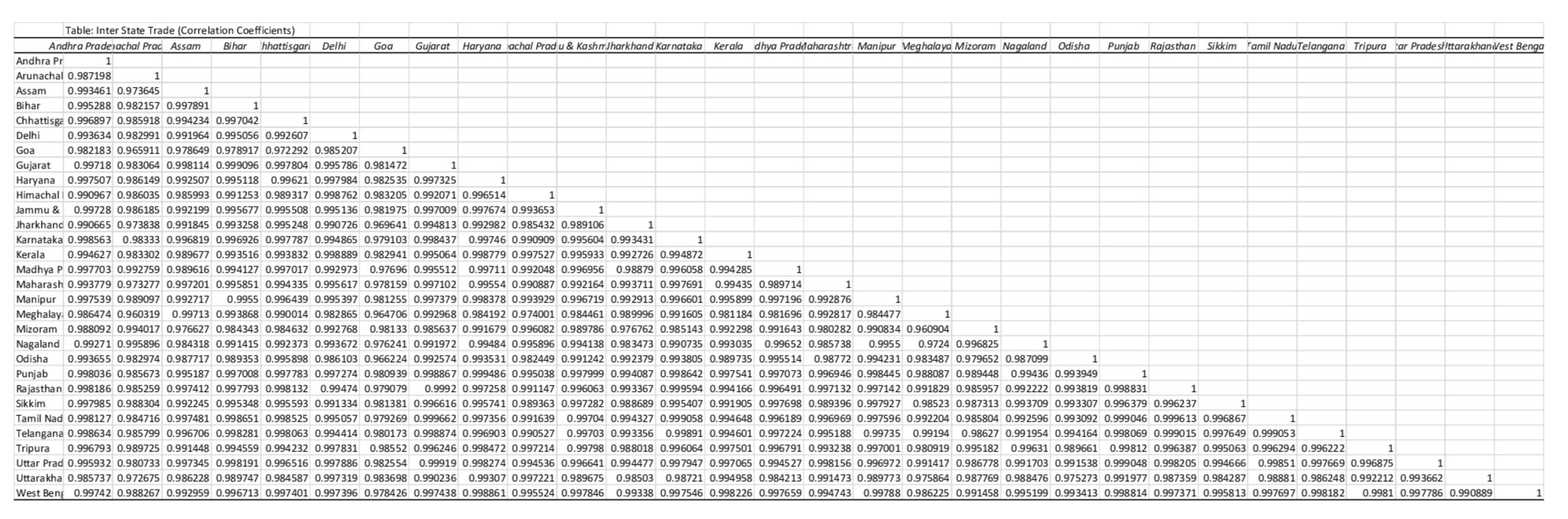 - First of all, One Major Finding is From Table-4, we can observe that all the Correlation coefficients (inter item correlations) are >0.9 (very strong trade relations) among all Indian states. None of the relationships between different states is less than 0.9 strength. This indicates the overall inter-state trade in India.
